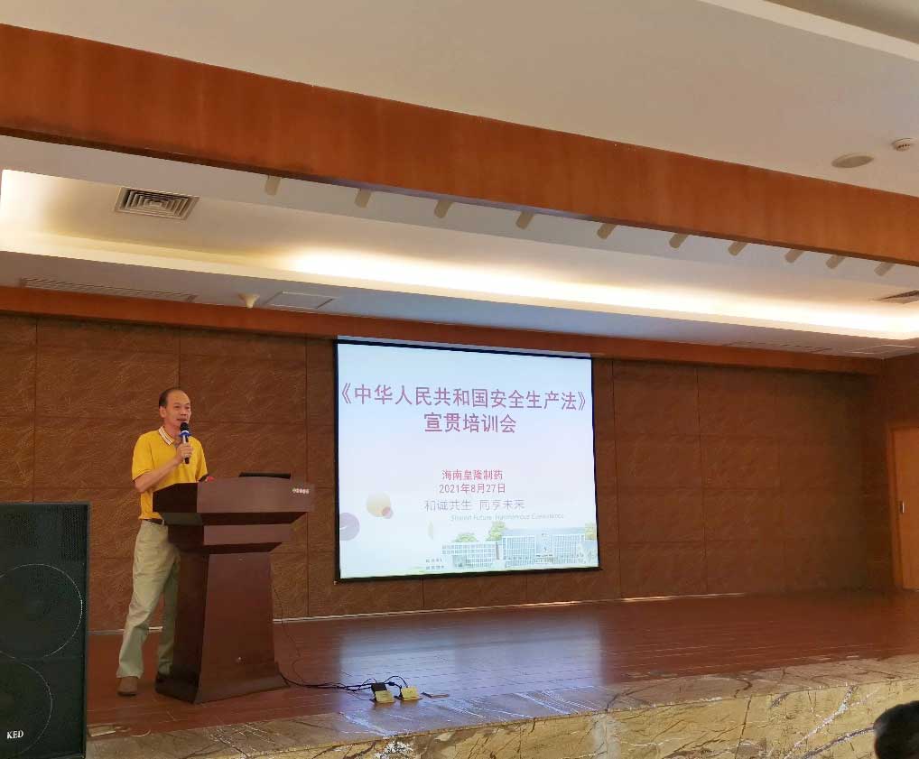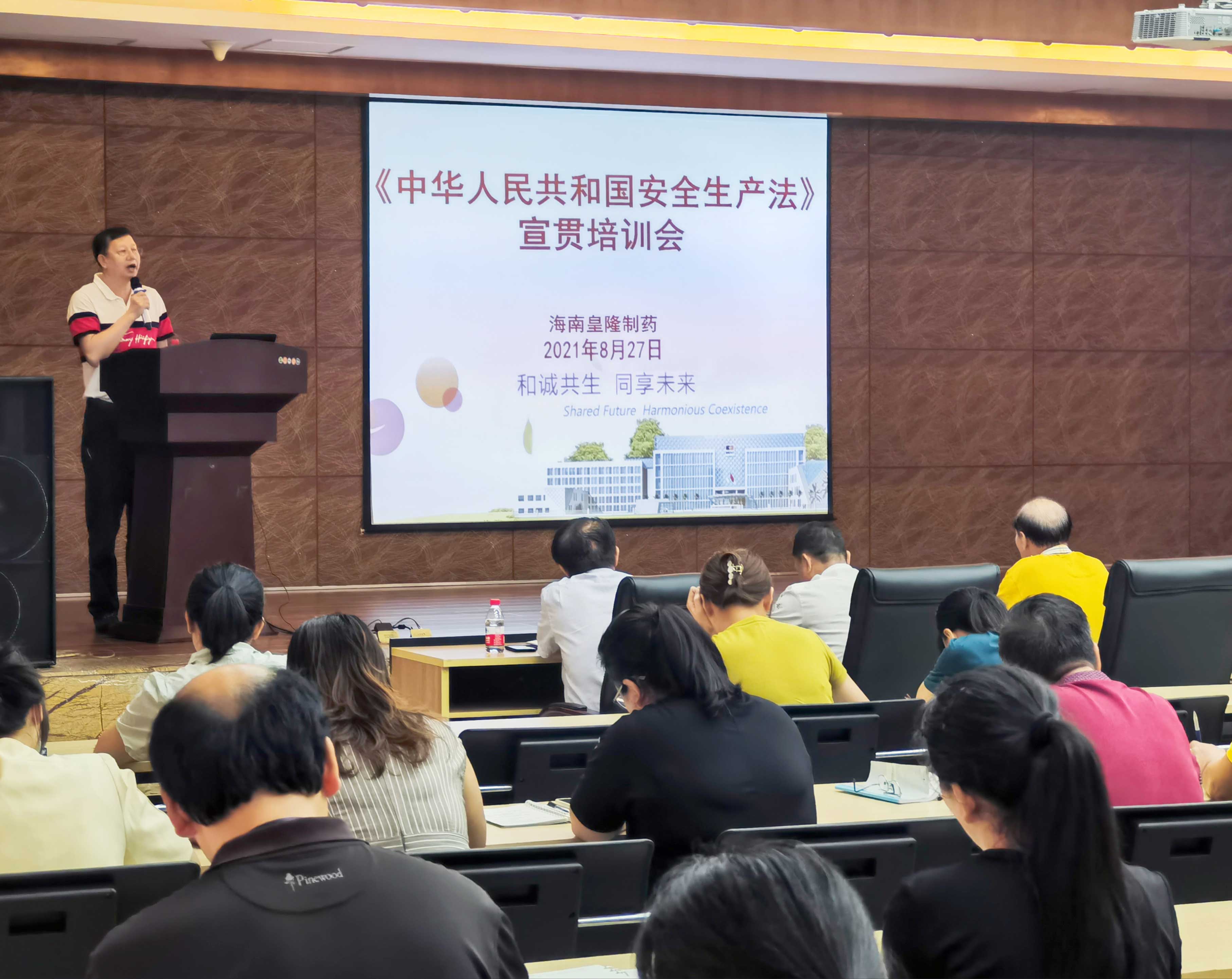 海南皇隆制藥股份有限公司高度重視此次新安全生產(chǎn)法的頒布實施,為了提高全體員工對新《安全生產(chǎn)法》的認識,全面加強安全生產(chǎn)法治觀念,提升企業(yè)安全管理水平,2021年8月27日組織開展新《安全生產(chǎn)法》宣貫培訓(xùn)會議,公司安委會主任陳益智、副主任史江永、何晶及陳國華、馬和東、葉華等16名安委會成員、公司專職(兼職)安全員、各部門領(lǐng)導(dǎo)及骨干成員等參加了此次培訓(xùn)