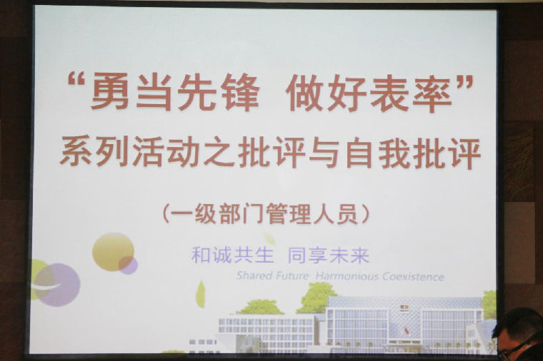 結(jié)合企業(yè)自身情況,陳益智總經(jīng)理對(duì)所有管理干部提出了五點(diǎn)要求,一是各級(jí)干部要嚴(yán)格遵守公司紀(jì)律和制度,二是要加強(qiáng)自身修養(yǎng)和學(xué)習(xí),三是要高標(biāo)準(zhǔn)執(zhí)行法律法規(guī),四是要在領(lǐng)導(dǎo)干部隊(duì)伍中率先垂范開(kāi)展自我批評(píng),五是要弘揚(yáng)企業(yè)文化和創(chuàng)新精神。為此,陳總號(hào)召全體管理干部以批評(píng)和自我批評(píng)為主要方式,在全公司范圍內(nèi)開(kāi)展“勇當(dāng)先鋒 做好表率”系列活動(dòng)。